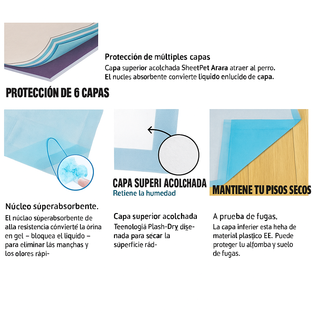 Absorbe en mayor medida que las comunes, ya que vienen con un gramaje mayor. ANTIBACTERIAL Y BLOQUEADOR DE OLORES- Facilita entrenamiento de perros, indicándoles un lugar específico donde hacer sus necesidades.-